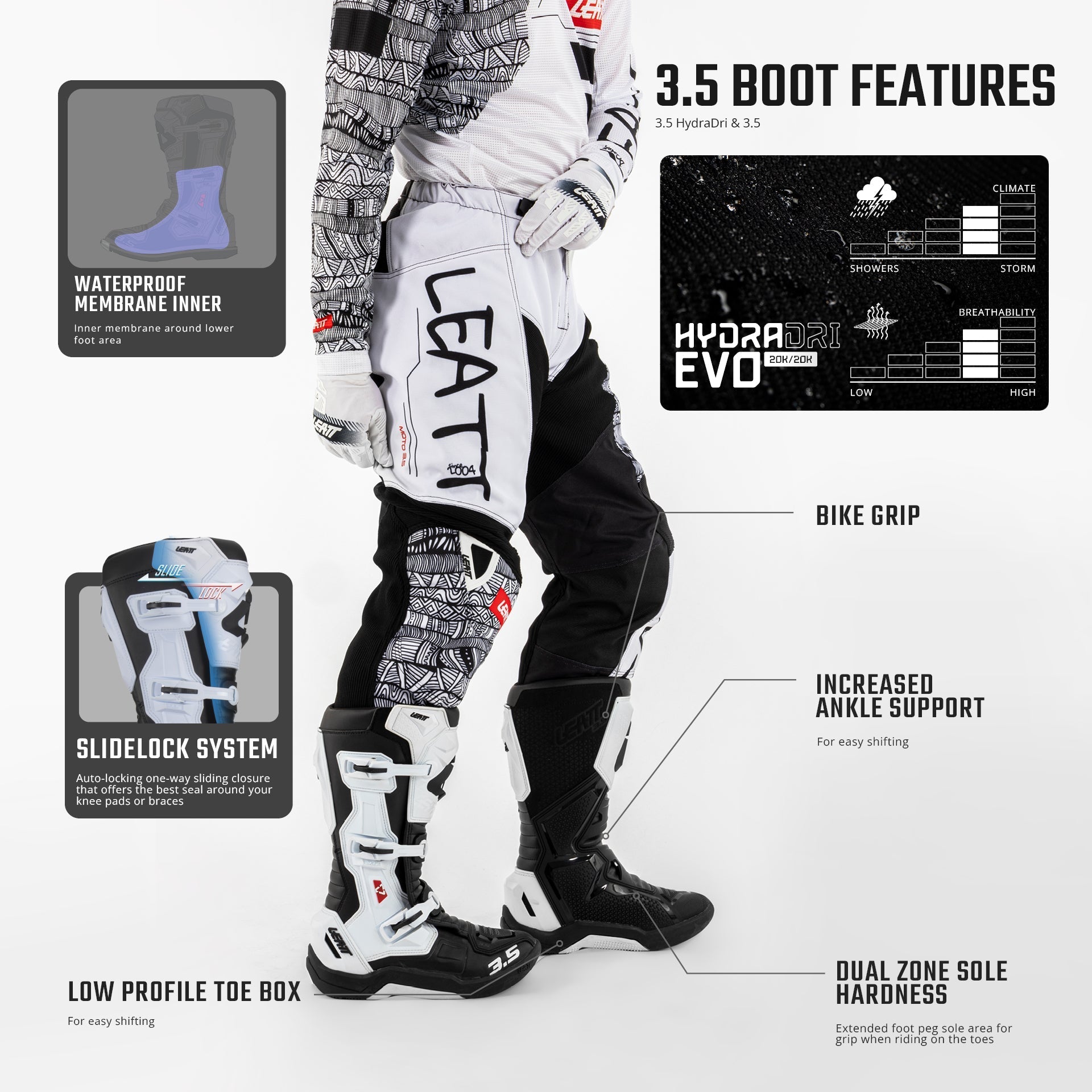 Gli stivali Moto 3.5 HydraDri offrono prestazioni essenziali con protezione integrata per la pioggia. Dotati della membrana HydraDri EVO di Leatt, garantiscono impermeabilità 20K e traspirabilità 20K per mantenere i piedi asciutti all'esterno e freschi all'interno. Il sistema SlideLock e le fibbie rinforzate in polimero creano una calzata sicura e stabile, mentre un pannello con fibbia aggiunge ulteriore sostegno. Il profilo interno piatto con TPU antiscivolo offre una solida sensazione di guida, mentre la punta sagomata con puntale in metallo garantisce cambi di marcia fluidi e una maggiore durata. La suola Enduro aggiunge trazione quando è il momento di scendere e spingere. Certificato CE e pronto per affrontare le intemperie, il 3.5 HydraDri è progettato per farti muovere, con la pioggia o con il sole.