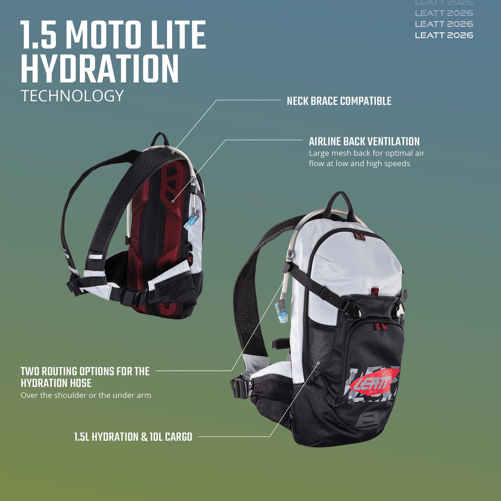 Se cerchi una protezione aggiuntiva dagli urti per la schiena, è possibile inserire una protezione certificata CE. Altre caratteristiche includono: una tasca rimovibile per gli attrezzi, bordini riflettenti di sicurezza, un fischietto di emergenza e un pannello termico per mantenere caldi i liquidi quando necessario. Hydration Moto Lite 1.5 è progettato per adattarsi con o senza tutore cervicale Leatt.